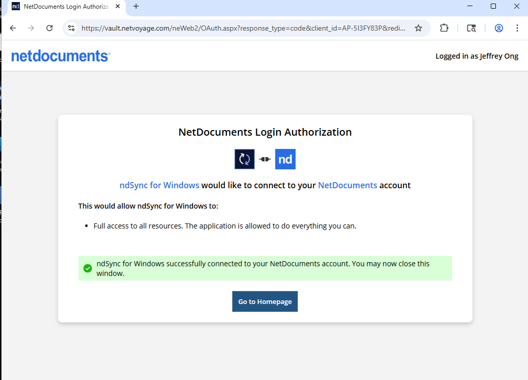 Step 3. Authorize your device if prompted. Once ndSync successfully connects, you should see a screen like the example below.