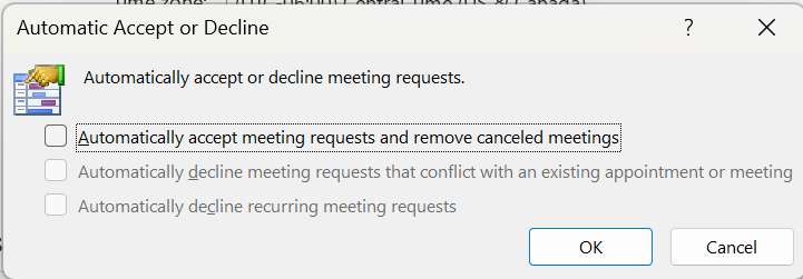 Step 5: Change this from “Automatically accept or decline meeting requests” to “Automatically add meeting invitations to calendar and optionally decline requests” or better yet, uncheck “Automatically accept meeting requests and remove canceled meetings”