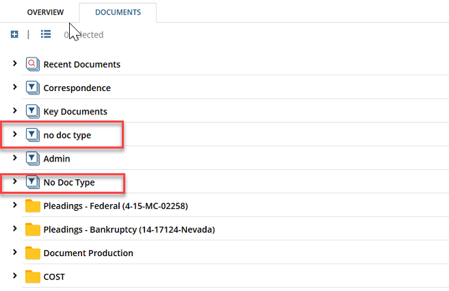 You may notice that certain matters have two folders with the same name—one in proper case and one in lowercase. For example, you might see both a No Doc Type folder and a No Doc Type folder, each containing a different number of documents.